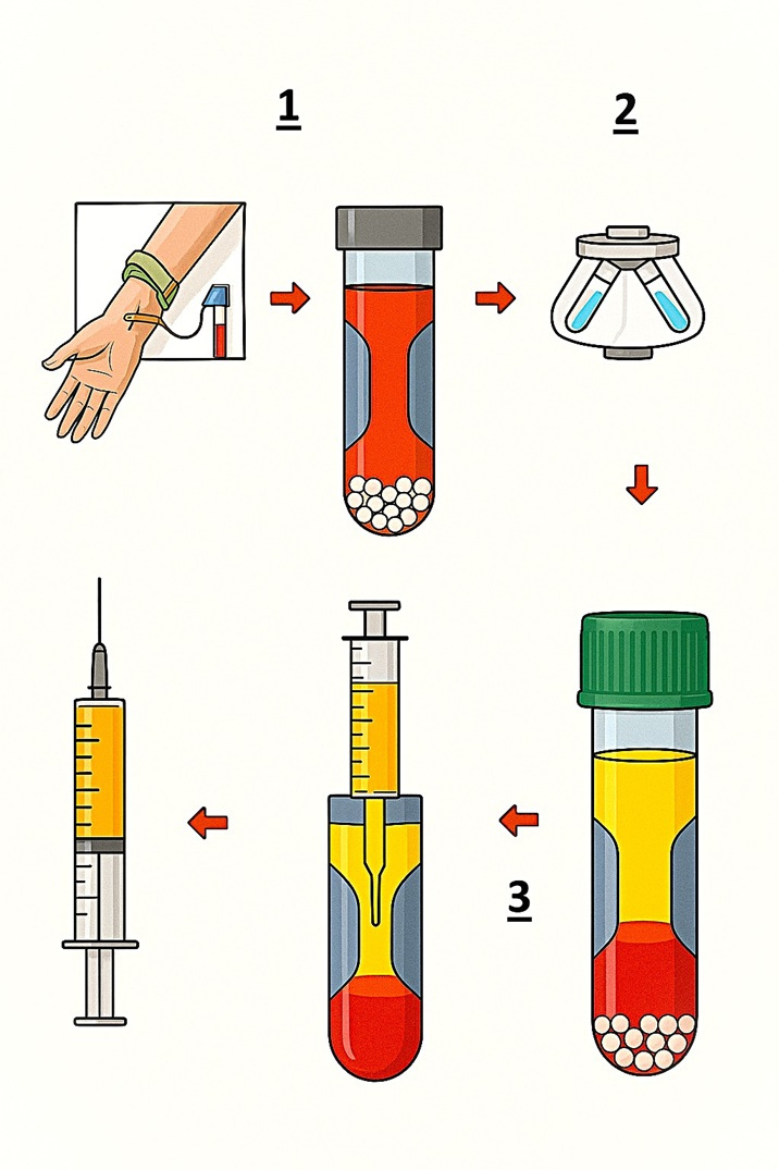 The enriched serum is immediately extracted with a sterile syringe and re-administered as a point-of-care, autologous regenerative treatment.